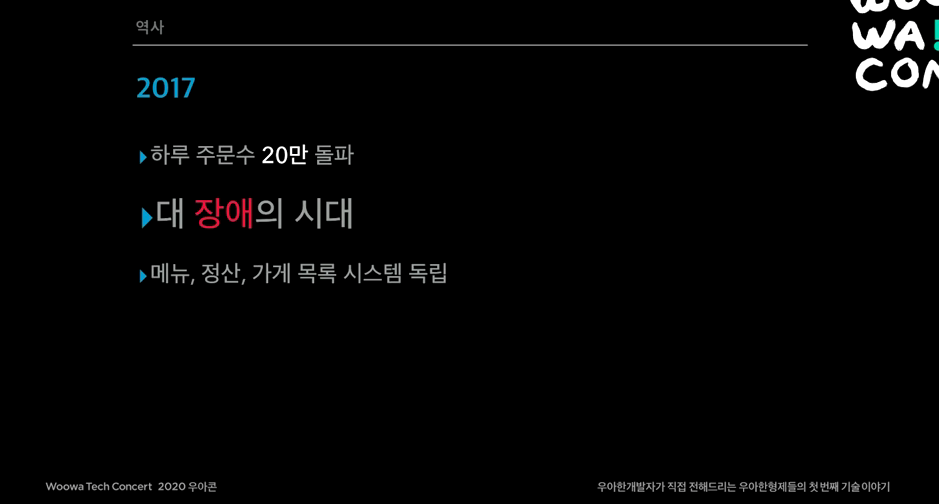 하나의 시스템, 하나의 데이터베이스로 폭발적으로 늘어가는 트래픽을 감당하지 못하고, 결국 배달의민족은 대장애 시대를 맞이했습니다.
