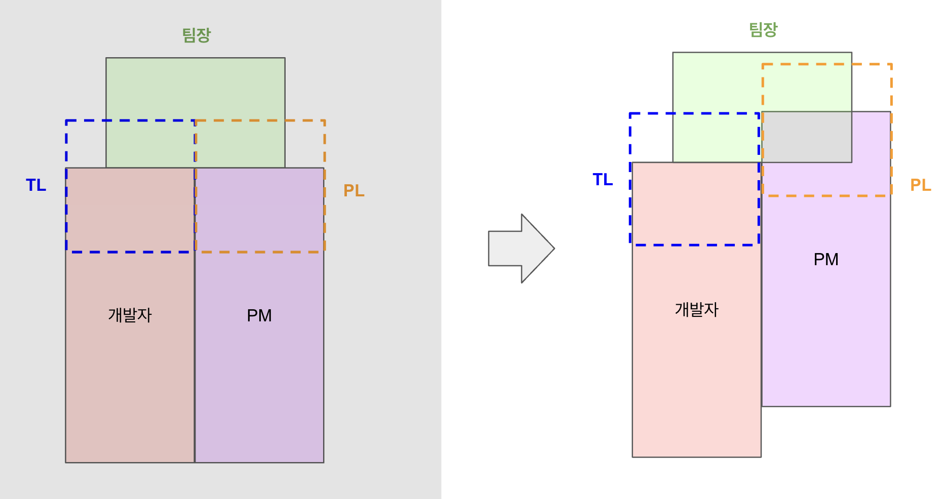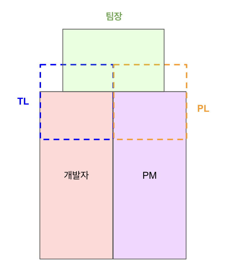 우리팀은 개발자와 PM이 함께 있는 목적 조직이다. 그래서 개발자,PM 기준으로 생각을 시작했다. 팀장의 업무 영역이 다른 직군의 업무와는 겹치지 않을 것이라고 생각했다. 팀장의 역할 중 일부를 TL, PL 에게 위임할 수도 있어보였다. 나는 그동안 TL 로서 팀장에게 개발자들의 관리를 위임받아왔다. PL 이 있다면 PM 구성원의 관리를 위임할 수 있을 것이다.